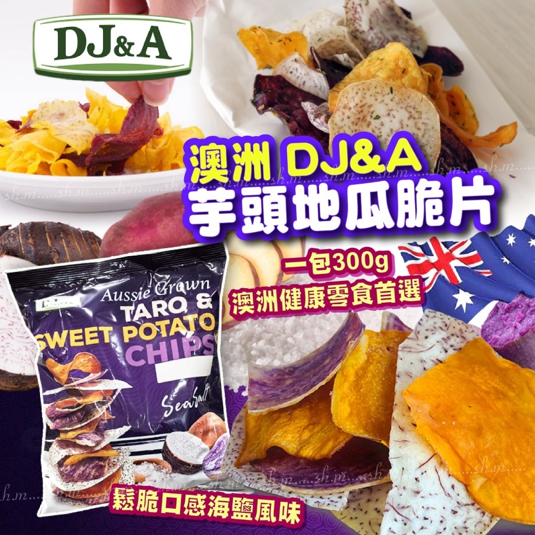 澳洲 DJ&A芋頭地瓜脆片300g ❌❌截單日:8/5/2024 $108/包;2包以上$98/包 🚚🚚到貨日:6月中下旬 澳洲 DJ&A 薯片系列😍,DJ&A 團隊又一力作💪🏻,超級健康有營之選😎,想食薯片又怕肥~試下呢隻DJ&A既薯片~🤭🤭🤭 🚫無人工香料 🚫無添加味精 🚫不含人工色素 🚫不含人工防腐劑 🚫不含基因改造成分 -產地:澳洲 -規格:300g -保存期限:生產日起計 📣每批效期略有不同以實際為主 📣效期:商品銷售速度快,每批都是最新生產,依實際出廠為主。 📣包裝:依季節或每批生產可能略有不同。 -保存方式:避免陽光直射,請置於陰涼乾燥。 -過敏原資訊:本產品與其它含有堅果與芝麻種子的產品於同一工廠生產,食物過敏者請留意。