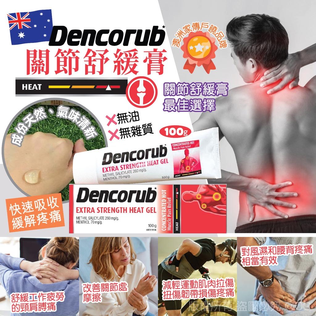 澳洲 Dencorub 關節舒緩膏 100g ❌❌截單日:21/6/2024 💰$59/支;2支以上$49/支 🚗🚗到貨日:9月中下旬 ✅澳洲家傳戶曉的品牌👍🏻👍🏻 ✅安全實惠,效果口碑極佳👍🏻👍🏻 生活中,關節位置經常會受到磨損和傷害😱 特別是熱愛運動的人仕🚴⛹️♂️🏊關節處的傷痛更是家常便飯❗️ 👵🏻👴🏻還有年紀漸長,關節病變帶來的痛楚更加辛酸😭❗️ 使用一般舒緩軟膏時都有股藥膏味😖😖 想擺脫關節痛同時不會「成陣味」,這款Dencorub關節舒緩膏就是最佳選擇👍🏻 ⭐Dencorub關節舒緩膏,没有傳統止痛膏的那種刺激的氣味而且氣味清新⭐ 🌱成份天然🌱 ❌無油❌無雜質 🌟快速吸收,緩解疼痛🌟 ✅改善關節處摩擦 ✅緩解關節痛和肌肉不適 ✅對風濕和腰背疼痛亦相當有效 ✅舒緩工作疲勞所引致的頸肩膊痛 ✅減輕因運動引致肌肉拉傷扭傷、韌帶損傷的疼痛 -規格︰100g -產地︰澳洲