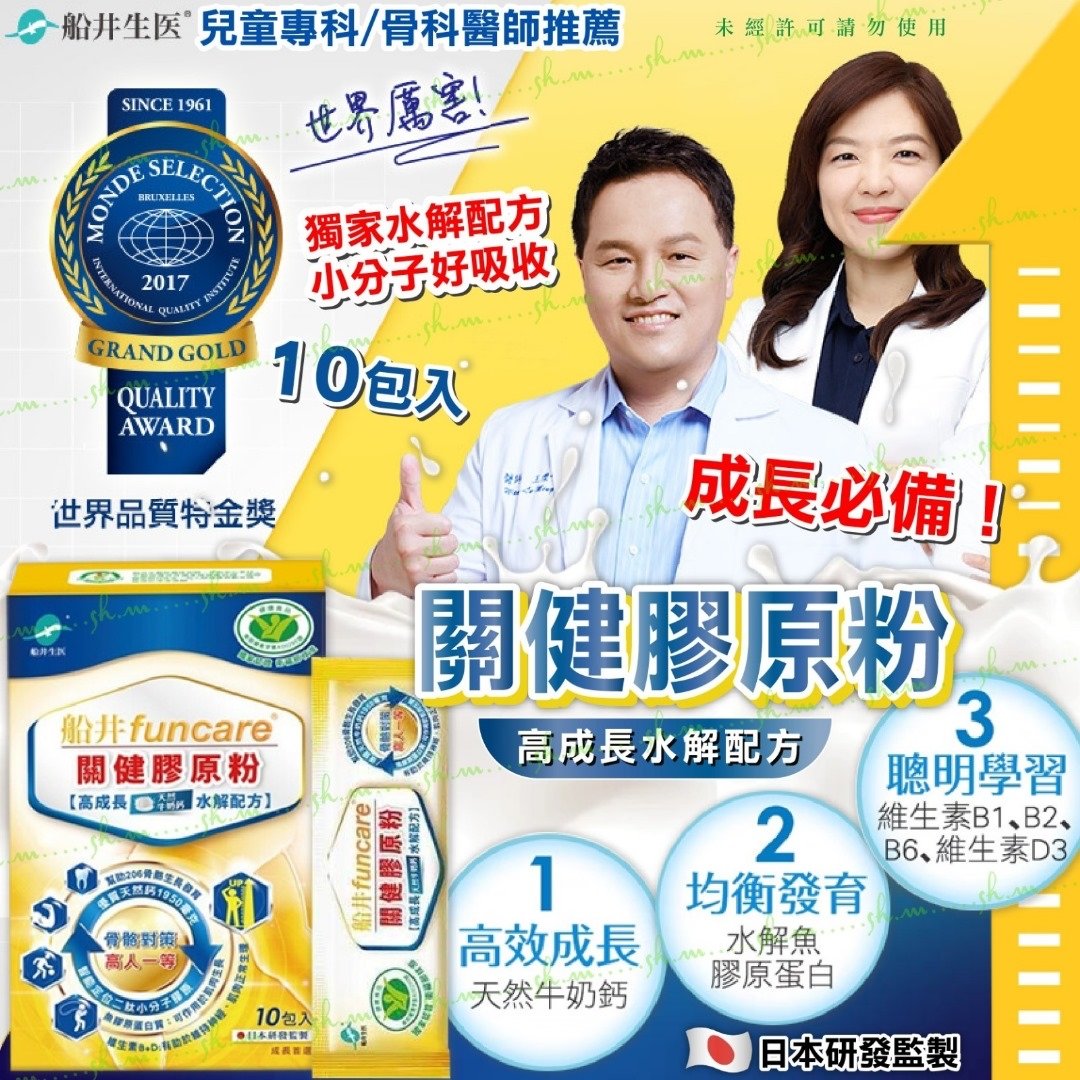 船井生醫 funcare 關健膠原粉(10包入)高成長水解配方 ❌❌截單日:2/5/2024 💰$145/盒;2盒以上$135/盒 🚚🚚到貨日:6月中下旬 家長群組討論度爆表、媽媽們瘋搶的… #船井高成長膠原鈣 船井生醫 funcare 關健膠原粉(10包入)高成長水解配方 孩子的成長只有一次‼️必須好好照顧 輕鬆補充關健元素✅牛奶鈣 ✅維生素D3 ✅關健二肽膠原 骨力×靈敏力×生長力💪一次擁有 ☑️最完整的高成長配方 ☑️國家認證 衛福部核准 ☑️台日五年醫學實證 -> 提高兩倍鈣吸收率! ☑️天然牛奶鈣 + 魚膠原蛋白質 + 維生素D3 ☑️四效合一,幫助孩子全身骨骼、肌肉、神經與環節均衡發育 國際級實驗室 814項安全檢測合格 衛福部公告SGS過敏原檢測合格 骨質健康食品認證 台日健康食品雙認證 榮獲世界品質評鑑大賞-最高榮譽特金獎 -產地:台灣 -規格:一盒10包 -保存期限:生產日起計2年(效期為廠商最新批次) -保存方式:避免陽光直射,請置於陰涼乾燥。