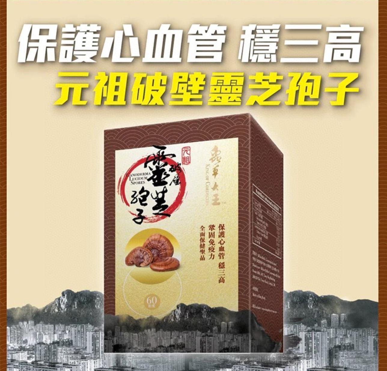 蟲草大王品牌 破壁靈芝孢子(元祖) ❌❌截單日:11/6/2024 💰$198/樽;3樽以上$180/樽 另每買3樽送試用裝10粒 🚚🚚到貨日:6月中下旬 保護心血管 穩三高 鞏固免疫力 抗頑症 全面保健聖品 《元祖破壁靈芝孢子》是滋補強身必備之選。不少人飽受慢性健康問題困擾,例如心血管疾病、高血壓、糖尿病等。想預防勝於治療,日常保健是不二法門。天天服食元祖破壁靈芝孢子,為身體建起多重保護網,讓你回復健康活力。 《元祖破壁靈芝孢子》八大保健功效 - 保持血管柔韌、有彈性 - 有助穩定血脂、血糖、膽固醇 - 促進血液循環,增強心肌供氧量 - 鞏固免疫力,對抗頂症 - 保肝排毒,加速新陳代謝 - 改善消化系統 - 抗疲提神,安神助睡 - 延緩老化,美容養顏 食用方法 口服,每日1-2次,每次1-2粒,飯後服。小童服用份量減半。 產品成份 元祖破壁靈芝孢子 包裝數量 60粒 保存方法 請存放於陰涼乾燥處,避免雪藏及陽光直射。 注意事項 由於內含成分屬天然,因此產品之顏色略有深淺。 食用期:2025