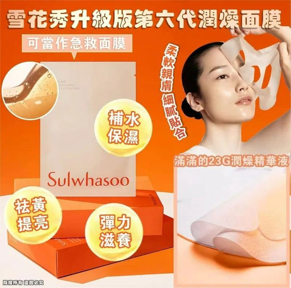 雪花秀升級版第六代潤燥面膜 (1套5片) ❌❌截單日:1/7/2024 💰$125/套;2套以上$115/套 🚗🚗到貨日:9月下旬 滿滿的23G潤燥精華液浸潤在一張柔軟的面膜紙里💧 據說1片含有3分之1的潤燥精華,主打祛黃亮白⭐補水保濕💧調節水油💧平衡彈力滋養、促進後續護膚品的吸收💖 可以搭配潤燥精華使用,效果加倍、1周給肌膚1〜2次這樣的密集護理就行 也可以當作急救面膜來使用熬夜後用一片,絲毫看不出熬過夜,肌膚依舊很好💪🏻 是以人參為主要原料的韓方精華露面膜使用真的超級補水💧調和肌膚平衡,回復健康盈潤光澤💖 採用滋陰丹配方與5種珍貴原料,經過炮製提煉,凝疑煉成滋盈凝萃復合體💪🏻 幫助提升活力,彈力,通透力,修護力和滋養力💖 能亮白膚色⭐補水保濕💧修復粗糙、淡化斑點痘印、緊致抗皺去細紋,還可以急救💖 以棉絨為原材料製作的活性面膜紙,柔軟親膚,細膩貼合⭐ 活性面膜紙鎖住層層精華幫助肌膚吸收營養深徹浸透,源源水潤直達肌底⭐ 大家都知道雪花秀家明星產品就是潤燥精華啦 喜歡貼面膜的,千萬別錯過這款潤燥面膜貼,每片23g,承載了3分之1瓶的潤燥精華👍🏻 還有個好聽的名字叫做女神面膜,用了就知道有多舒服❗去黃補水效果更強大👍🏻 一打開就聞到潤燥精華的淡淡的草本味,在數面膜期間能幫助舒緩心情, 極細的棉網面膜緊密無縫的貼合面部,涼涼的很舒服,將精華成分深層滲透肌膚,讓皮膚重新回到有生機的狀態〜 -規格︰1套5片