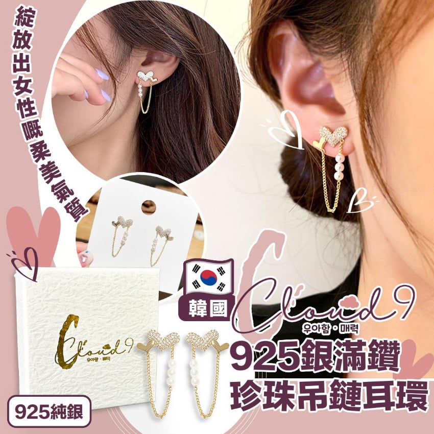 韓國製造🇰🇷 Cloud9 925銀滿鑽珍珠吊鏈耳環