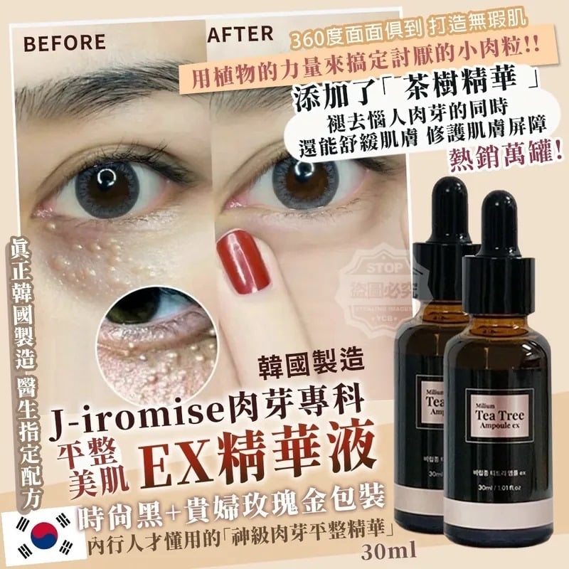 韓國製造 J-iromise 肉芽專科平整美肌 EX精華液 30ml ❌❌截單日:27/6/2024 💰$49/支;3支以上$39/支 🚗🚗截單日:9月中下旬 『 時尚黑+貴婦玫瑰金包裝 』高級感十足👍每天使用都賞心悅目 用植物的力量來搞定討厭的小肉粒🌿韓國最強平整精華EX 升級版來啦~ 配方比例再加乘😇價格還是超級親民😇 像肉芽、脂肪粒、角質粒、肉粒、疣 這些叫不出來的東西都算是小肉粒😩😩 將~將~內行人才懂用的「神級肉芽平整精華」 女人最在乎就是一臉瞧去便知一二的「面子」 要用就用我們出品的,真正韓國製造🔥醫生指定配方 肉芽泛指皮膚組織的增生,生長於不只眼周、臉部 身體上容易摩擦的部都有可能會產生,看似不傷身但卻對美觀十分有害 市面上的肉芽平整精華🌟往往忽略了肉芽漸漸褪去的過程 需要非常溫和的植萃成份同時修護肌膚 貼心的韓國保養品大廠 添加了「 茶樹精華 」 褪去惱人肉芽的同時還能舒緩肌膚🎉修護肌膚屏障、360度面面俱到打造無瑕肌 質地非常清爽😝每次洗臉/洗澡後取用1-2滴塗在小顆粒上就可以囉~ -規格︰30ml -產地:🇰🇷韓國 -有效期︰2027年2月
