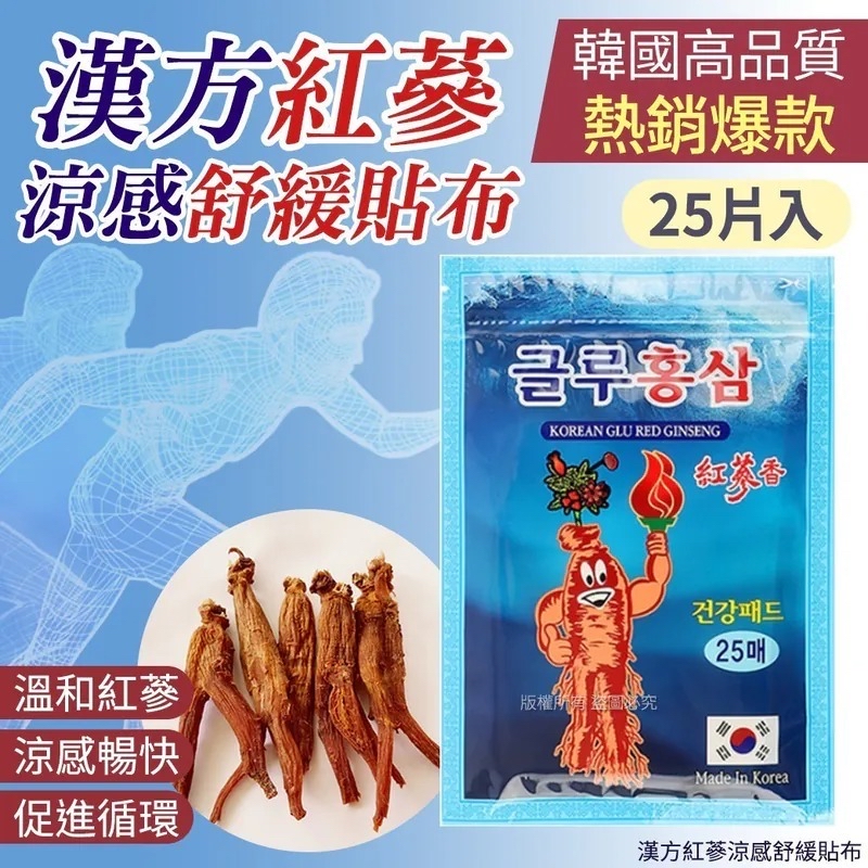韓國🇰🇷冷感舒緩貼布25貼(一套4包 / 一包25貼)屋 ❌❌截單日:20/7/2024 💰$49/套;2套以$39/套 🚗🚗到貨日:10月中下旬 #家家戶戶必備 #舒緩肌肉疲勞 韓國最大規模的人蔘生產地-錦山郡出產的,紅蔘味非常濃郁 ✅採用了漢方醫術製成,材質是比較薄的不易過敏而且非常服貼,更好撕取 ✔運動疲勞 ✔長時間站立 ✔婦女家事勞累 -規格:1套4包,每包25貼 -產地:🇰🇷韓國