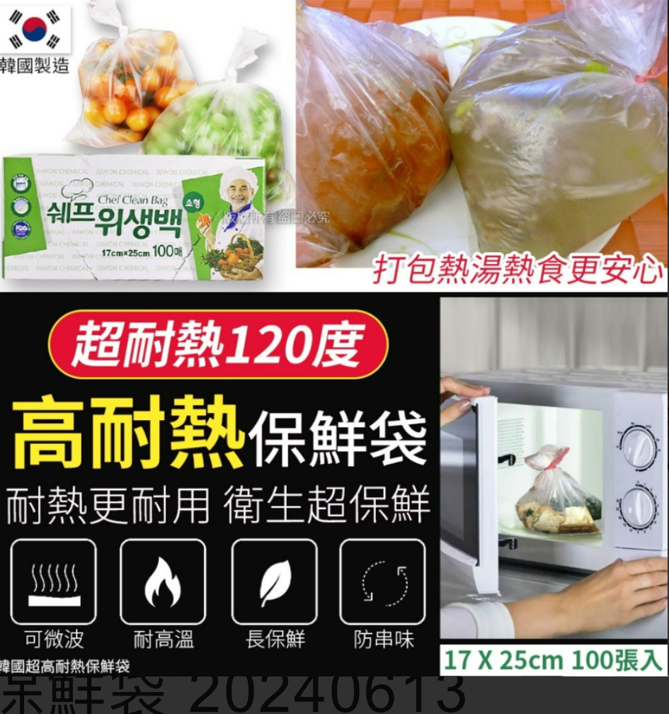 韓國🇰🇷超高耐熱保鮮袋(一套5盒 / 一盒100張) ❌❌售完即止 💰$39/套;2套以上$35/套 🚚🚚到貨日:8月下旬 🎉🎉韓國超高耐熱保鮮袋 超高耐熱達120度~ 由FDA、KC認證的HDPE材質 打包熱湯熱食更安心🥰🥰 ✅採用高密度製成,材質強韌不易斷裂 特殊網點花紋設計,袋口不易沾黏 分裝食物可延長保鮮、防止食物乾燥👌👌👌 強力韌性讓你裝食物方便 湯湯水水也不易外漏💦💦 📌🇰🇷韓國製造 📌耐溫度:60~120度 📌規格:一套5盒 / 17 X 25cm / 一盒100張相