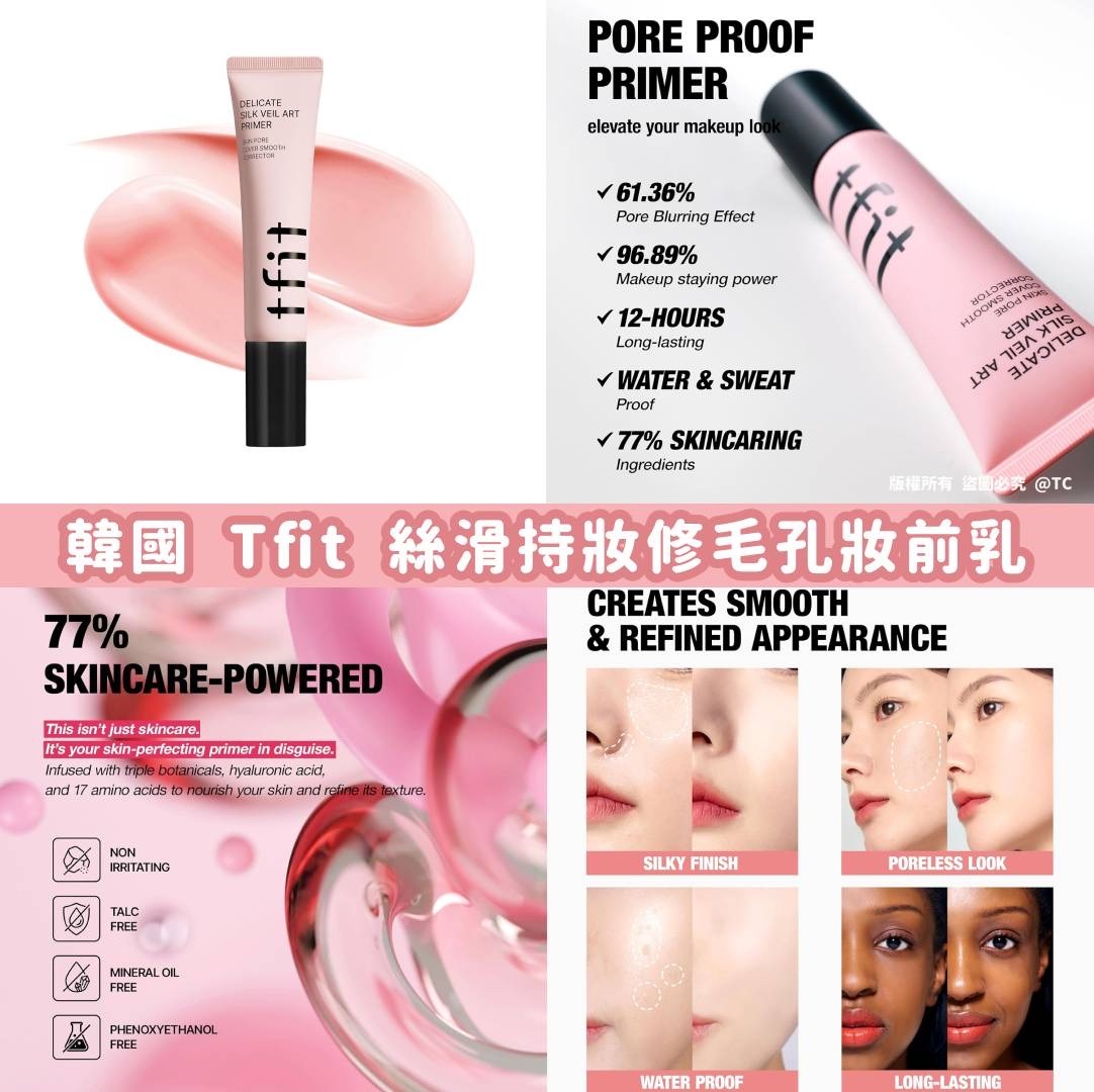 韓國 🇰🇷TFIT 裸妝妝前乳隱形毛孔隔離霜 30ml ❌❌截單日:19/6/2024 💰$79/支;3支以上$69/支 🚗🚗到貨日:8月中下旬 新品‼️貼服無瑕肌😍打燈霜💡 持久水潤💎冇曬毛孔+瑕疵🌺防水防汗💧 💡打燈霜 ➡撫平毛孔,凹凸不平和細紋等 ,12小時提升妝效,持久不暈染,防水防汗,展現桃子般的健康光澤 ✨獨有三重凝膠貼合系統:如磁鐵粘附皮膚,持久妝容,打造絲質面紗,防止暈染和褪色 ✨3種粉紅色複合物(桃花、櫻花、荷花):賦予肌膚粉紅活力,綻放亮麗光採 ✨77%的天然護膚成分:持久保濕柔滑,底妝長時間保持水潤,不會乾燥 ✨完成6類臨床試驗 ✨僅使用一次,毛孔面積減少 61.36% ✨使用8小時後毛孔面積減少53.54% ✨使用12小時後毛孔面積減少48.99% ✨與單獨使用粉底相比,只需使用一次底妝,就能保持 96.89% 的妝容長達 12 小時 ✨防水防汗,長時間保持柔軟 ✨通過皮膚測試,敏感肌膚可使用 -規格:30ml -保存期限:效期為廠商最新批次 -保存方式:避免陽光直射,請置於陰涼乾燥。 -注意事項: ※請確保將產品放在孩童和寵物接觸不到的地方 ※使用後如有不適,請暫停使用並諮詢專業醫師 ※如不小心噴到眼睛,請用清水沖洗10-15分鐘後,請立即就醫諮詢專業醫師