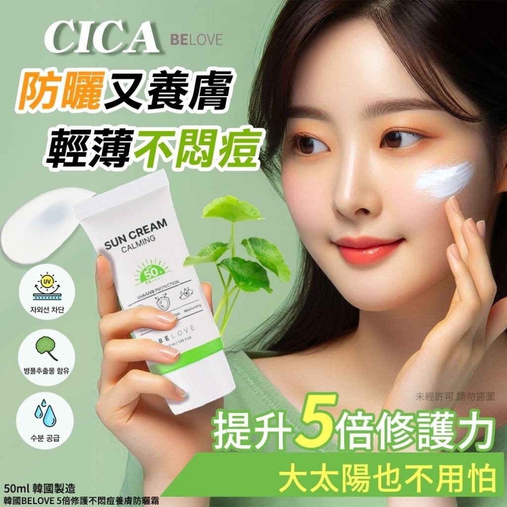韓國 BELOVE 5倍修護不悶痘養膚防曬霜 50ml ❌❌截單日:27/6/2024 💰$55/支;2支以上$45/支 🚗🚗截單日:9月下旬 🇰🇷🇰🇷韓國BELOVE推出 添加CICA的防曬霜 防曬☀+修復🌱+水潤💦 提升5倍修護力👆👆👆 太陽再大也不怕 ☀☀防曬又養膚,🌱🌱輕薄不悶痘 防曬同時也要溫和地做🌱🌱CICA護理哦! ✨✨含有積雪草萃取舒緩防曬霜 ✅鎮定因紫外線受刺激的肌膚 馬地卡索苷成分可以快速鎮定被曝曬的肌膚 ✅積雪草成分鎮定肌膚 保溼膜形成保護肌膚 ✅保濕肌膚長時持妝肌膚也不乾澀 -規格:50ml -產地:🇰🇷韓國 -有效日期/保存期限:2025年7月