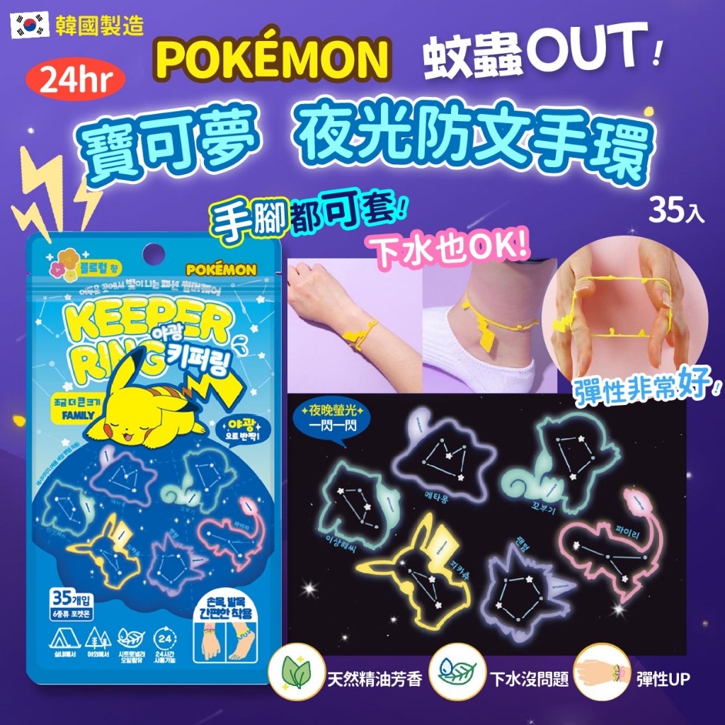 💢快閃💢 韓國 Pokemon 寶可夢防文手環 35入 ❌❌截單日:售完即止 💰$69/包;2包以上$59/包 🚗🚗到貨日:8月中下旬 🔥團員瘋狂敲碗~爆單超級燒!! 🔥韓國 Pokemon 寶可夢 防文手環 35入 #寶可夢_大人小孩的守護獸 🔴讓可可愛愛的寶可夢🔴 守護家中的小朋友~ 😍可愛造型的寶可夢防文手環~ 特殊螢光效果👍👍 🌙 在夜晚也能閃亮亮 🌟 夏天到了戶外蚊蟲特別多😱😱 外出最怕被叮咬😖 有了防蚊手環~可以套在手上、腳上 ⛔防止蚊子靠近來叮咬~ 24小時防蚊🌊想玩水也沒問題‼️ 🌿🌿天然精油芳香(香茅) 成分天然不刺激!可安心使用👌 迅速阻擋蚊蟲叮咬🦟🦟 使用矽膠材質彈性UP!UP! 戴著舒適! 🙆♂️🙆♂️大人小孩都合適~~~ 💝使用方法: 將本品佩戴在手腕或腳腕等部位~ 🧚♀️可以同時戴2個以上~ ❓香味會持續24小時。香味消失後可作爲時尚帶使用。 -產地:🇰🇷韓國 -規格:35入/包 (6種神奇寶貝造型混裝) -保存期限:效期為廠商最新批次 -保存方式:避免陽光直射,請置於陰涼乾燥。 -注意事項: ※不使用時,請放入自封袋或密閉容器、包裝袋中保存~防止香氣散發! ※請勿用於其他用途。 請勿用嘴吮吸或揉搓眼睛!