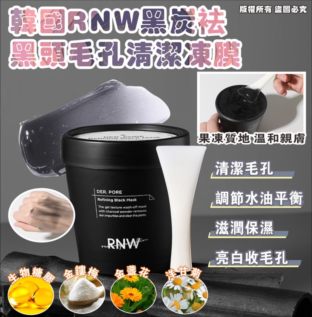 韓國 RNW 黑炭袪黑頭毛孔清潔凍膜 150ml ❌❌截單日:18/7/2024 💰$89/盒;2盒以上$79/盒 🚗🚗到貨日:9月中下旬 懶人唔鍾意泥膜乾左後要刷刷刷清潔嘅話 可以用呢個凍膜🥰🥰🥰 呢個唔係一般普通補水敷面膜型凍膜🙆🏻♀️ 而係可以幫你清潔毛孔 去黑頭㗎~ 4大功效👇🏻👇🏻 ✓ 清潔毛孔內污垢 ✓ 調節水油平衡 ✓ 滋潤保濕 ✓ 亮白收毛孔 果凍質地 溫和親膚😚 敏感肌絕對可用✅ 凍膜採用 韓國本土特產江源道橡樹黑炭🖤 通過高溫1200度燒製而成! ✓ 黑炭內負離子有助深層吸附/清潔毛孔內污垢油脂 ✓ 調理角質 清除黑頭白頭 還原毛孔健康狀態 三種植物萃取🌿🌼🌻 分別係金鏤梅 金盞花 洋甘菊 ✓ 溫和抗敏 舒緩修護皮膚 滋潤保濕 仲有生物糖膠-1😆 ✓ 軟化角質層 促進吸收 充分補水 達致水油平衡 更通過使用前後水油平衡測試✅ 最後仲有抗氧成分艾地苯🙆🏻♀️ ✓ 改善暗沉, 亮白收毛孔 備註:有配白色鏟子 使用方法: - 建議一星期用1-2次 - 用內附刮捧將黑色凍膜抹喺面上 - 記得要厚敷,凍膜最好覆蓋皮膚,抹到全黑色就啱! - 建議敷1個鐘或以上,等有足夠時間淨化毛孔~ -規格:150ml -保存期限:效期為廠商最新批次 -保存方式:避免陽光直射,請置於陰涼乾燥。 -注意事項: ※請確保將產品放在孩童和寵物接觸不到的地方 ※使用後如有不適,請暫停使用並諮詢專業醫師 ※如不小心噴到眼睛,請用清水沖洗10-15分鐘後,請立即就醫諮詢專業醫師