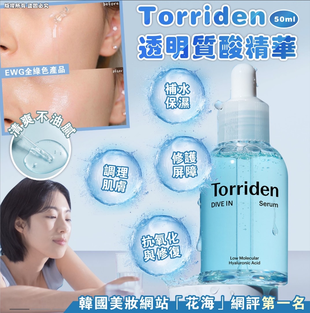 韓國 Torriden 透明質酸精華50ml ❌❌截單日:27/6/2024 💰$99/盒;2盒以上$89/盒 🚗🚗到貨日:8月中下旬 韓國美妝網站「花海」網評第一名‼️且有三冠王的3秒精華🏆 韓國本土寶藏級別精華💦補水和強化肌膚屏障的效果一流👍🏻 ✨補水保濕 ✨修護屏障 ✨調理肌膚 ✨抗氧化與修復 ❌不含香精、酒精、防腐劑等20種有害物質 ✅EWG全綠色產品,慜感肌也可放心使用 質地流動性很好,清爽不油膩,容易推開好吸收,油皮完全不需要擔心會給肌膚帶來負擔‼️ 特別適合想要補水和修復的易敏肌或屏障受損的肌膚👍 ⚠ 淺藍色的精華液並不是採用色素製成,而是因為產品中添加了鹼性的孔雀石提取物,因此產生的自然顏色。 ❣使用方式: 以滴管取適量精華液💧,輕點於臉上後,以指腹畫圏,或由下往上拉提塗抹全臉,塗勻後輕拍或輕壓按摩使肌膚吸收💆 -規格:50ml -保存期限:效期為廠商最新批次 -保存方式:避免陽光直射,請置於陰涼乾燥。 -注意事項: ※請確保將產品放在孩童和寵物接觸不到的地方 ※使用後如有不適,請暫停使用並諮詢專業醫師 ※如不小心噴到眼睛,請用清水沖洗10-15分鐘後,請立即就醫諮詢專業醫師
