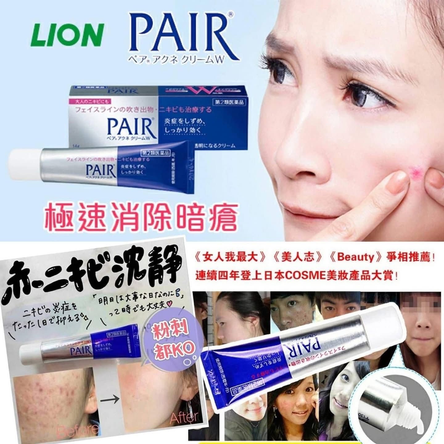 🇯🇵日本人氣獅王PAIR暗瘡膏 24g 【大支裝】 ‼️少量現貨‼️售完即止 💰$69/支,2支以上$65/支 🛬1~2星期到貨 😨搶到日本都斷既暗瘡膏 🉐快速有效消除開/閉口粉刺、退紅抗炎。🉐 ‼️【針對紅腫、化膿痘痘】‼️:具有排出脂肪粒、殺滅原因菌、消除紅腫的3道功效。 ‼️【對正在生長的痘痘】‼️:可以抑制脂肪粒的形成並逐漸消除。 ‼️【對已經成熟的痘痘】‼️:能夠析出脂肪粒,從痘痘根部進行治療。非常溫和,清爽易吸收! 💟這款膏使用起來也是超級方便,先將臉部清潔乾淨,然後擠出適量到指尖,塗抹到痘痘粉刺的患處,塗抹的藥膏幹了後,對肌膚進行保濕等護理。如果在粉刺痘痘剛出現時就使用它,有更好的效果,也不易有殘留哦! 💟白色的乳液狀,很淡很淡的味道,查了一下,獅王暗瘡膏弱酸性的成分,很溫和。擦在眼睛旁邊,也一點都不熏,對閉口也有效. #ペアアクネクリームW24g #日本 #獅王 #PAIR #日本藥妝