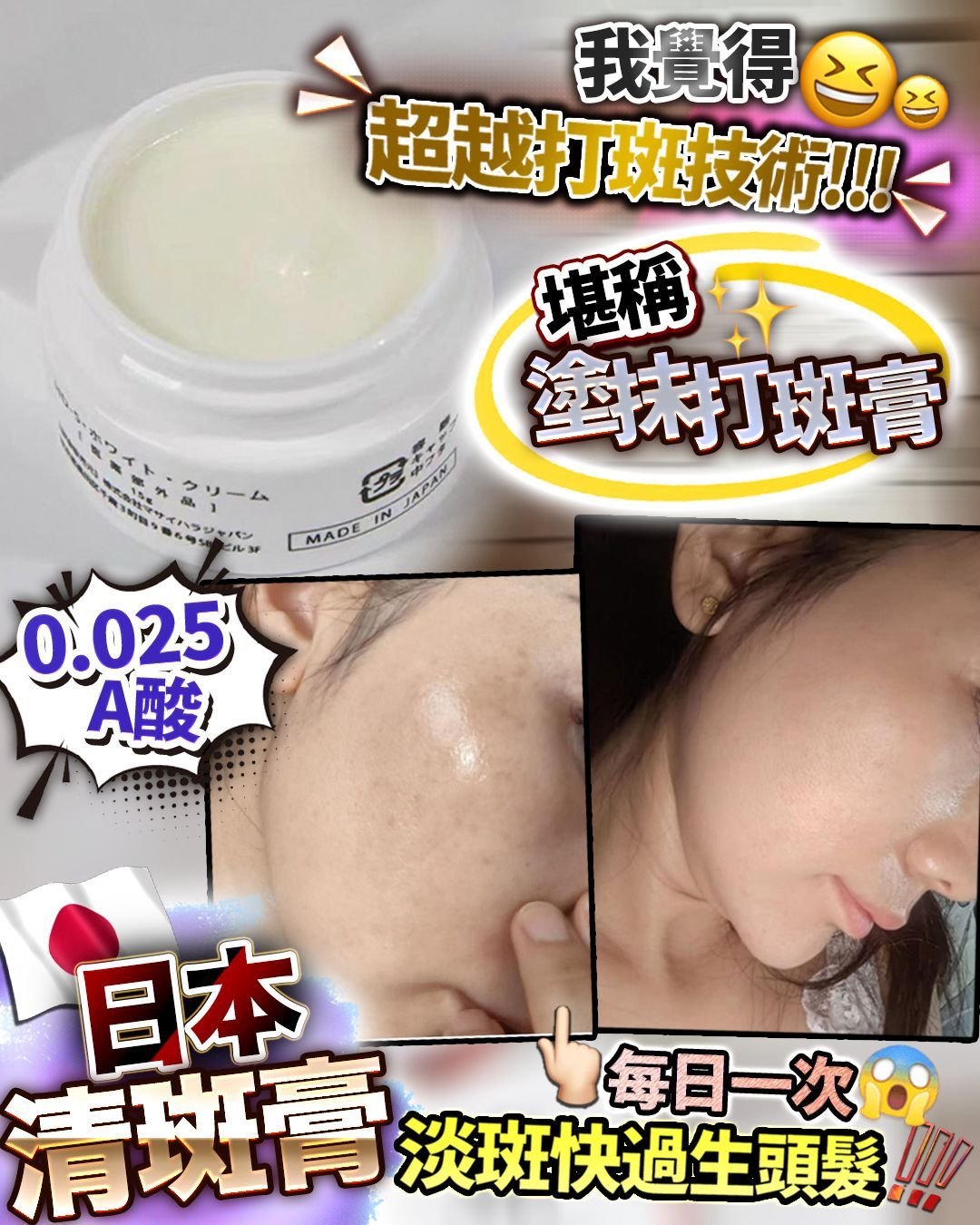 🇯🇵日本清斑膏15g ‼️供應商現貨‼️售完即止 原價$388❌❌ 店主優惠💰$188/瓶,2瓶以上$178/瓶 🚘2~3星期到貨 超爆單 🔥 一到貨 都唔夠派 🤭 下星期陸續出貨 我覺得超越打斑技術堪稱塗抹打斑膏 日本皮膚科醫院🏥出品 什麼老人斑 、黃褐斑 、肝斑 、痘印 、疤痕 你諗到有關色素嘅野 都幫你一鋪清 😱😱 🇯🇵日本 祛色素 🤴 王者 ✨✨ 醫院級濃度 內含A酸 #清斑膏 這是1995年🇯🇵日本大學(日本最高學府)美容外科研發,肝斑大概2-3個月,老人性色斑,各種色素沈澱大概2-6周。 皮膚的新陳代謝加速,表皮變厚光澤度也變好了,促進了真皮層的膠原蛋白分泌,暗沈和小細紋也能得到改善。 幫你 「重點」 「重點」 「重點」 清斑清色素 ⚠️千祈唔好大範圍塗抹 ⛔️孕婦/哺乳期絕對不能使用⛔️ 內含0.025% A酸 適應期一個月 2天一次 之後可每晚使用*有使用過A酸的姐妹可以直接每天使用 ; 由於含A酸成份 不能長期使用 2-3個月需停用 ⛔️ 使用方法: ‼️日間必須塗防曬霜‼️ 晚間使用 在化妝水,精華,面霜,面膜等基礎護膚後,睡前最後一步使用 只能「點」在有斑的地方!!堅決不可大面積塗抹!!如果有小的斑點可用棉簽點‼️薄薄一層‼️ 注意事項 01 . 使用時第一個月可能出現泛紅或蛻皮,需隔日使用。 02. 使用時需避開眼部/嘴部以及有傷口的部位。 03. 產品僅夜間使用,同時日間注意使用防曬產品做基礎防護。 04. 本產品應密封儲存在乾燥低溫環境。 🇯🇵日本製 15g