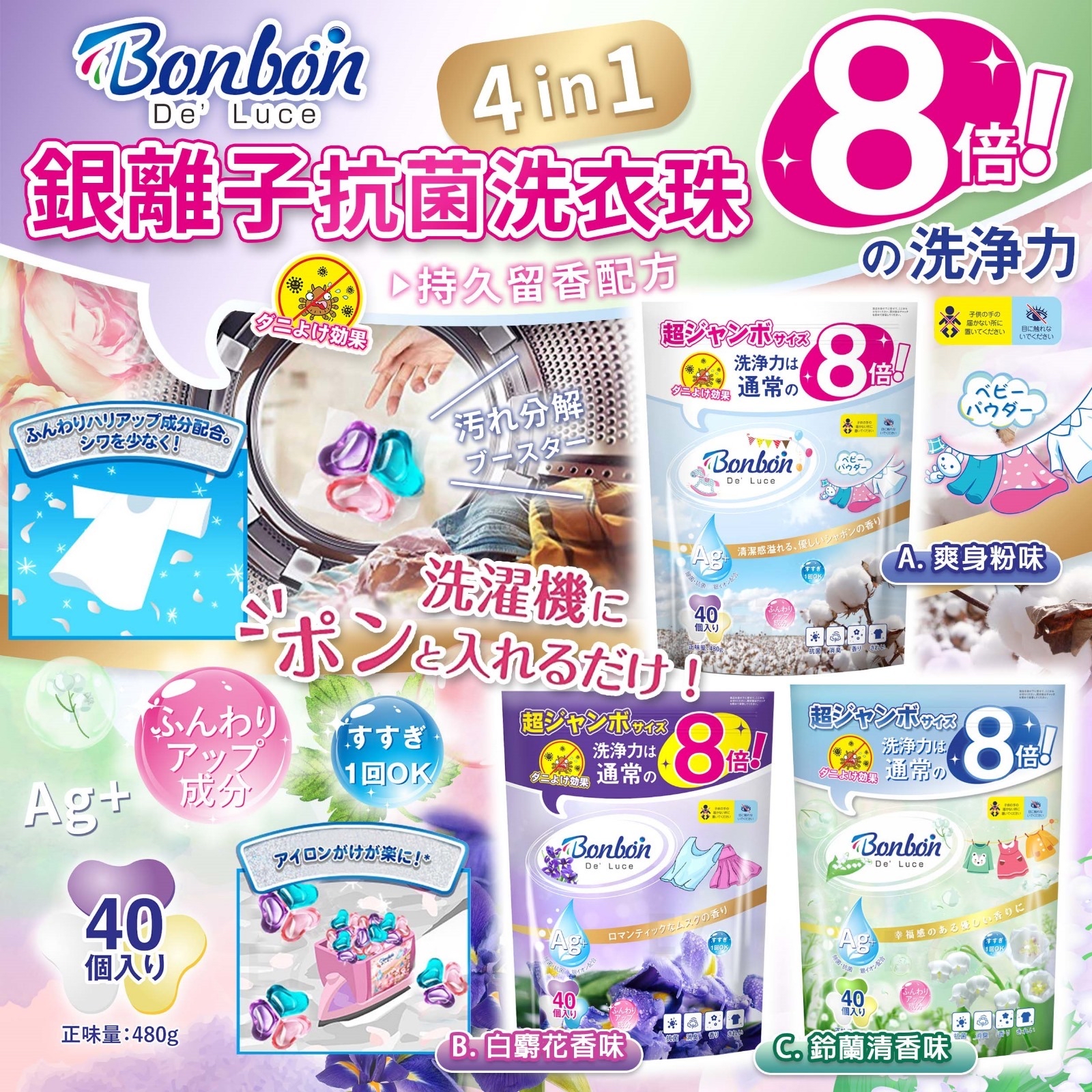 🇯🇵日本BON BON銀離子抗菌啫喱洗衣珠 (40粒*2包=80粒) 🕔截數日期 : 現貨, 售完即止 💰$78/套 📦預計到貨: 10月下旬 ✨4款味: A. 爽身粉味 ✨香港OL最愛 B. WHITE MUSK 白麝香 (💕💕香港人最愛, 真正BODY SHOP 果種經典香味😬😬) C. 鈴蘭清香味 💕💕幸福之貴族清香, 連英國皇室都愛嘅味道💕💕 D. 白桃味 👏👏 又係時候補貨啦‼️‼️除開只係$38/包 有40粒架😁😁 日本媽媽👩🏻勁鍾意用🙌一粒有齊✅潔淨, ✅抗菌, ✅柔順!! 🙀🙀除開只係$0.9/粒‼️ 👏👏正呀‼️ 真係好好用, 上次幾萬包比你地掃曬, 客人用完後不斷回購, 連日本媽媽都勁讚👍👍 日本BON BON 洗衣珠, 比一般普通洗衣珠j大粒 🦠🦠病菌BYE BYE👋👋 依家出面周圍咁多細菌, 一返屋企就要換衫👚🩳。洗衣液都用多左, 呢款🇯🇵日本BON BON 洗衣珠, 比一般普通洗衣珠大粒🙀🙀清潔力強倍, 最正係有銀離子抗菌⚡⚡咁洗完嘅衣服就更乾淨衞生啦💪🏻💪🏻仲有持久嘅清新花香🌼🌸 🙌一粒足夠洗一機衣服, 👨👩👧👦一家大細都夠用, 除開只係0.9/粒, 勁抵呀🤣🤣 🥳多種功能集於一身=✅清潔+✅柔順+✅護色+✅殺菌+✅除臭+✅清新花香 ✔比普通洗衣粉清潔力強8倍 🥳有效去除衣物頑固污漬💪💪, 令🥼白色衣服更潔白✔彩色衣服更亮麗✨✨✨ 🉐溫和配方, 柔順衣服👕 ❌不含熒光劑 🉐快速去污💦深層潔淨👍🏻 ⭕🚰凍水都可以極速溶解🚰 🉐自然清香香味持久,祛除噏味😍😍 🉐保質期3年