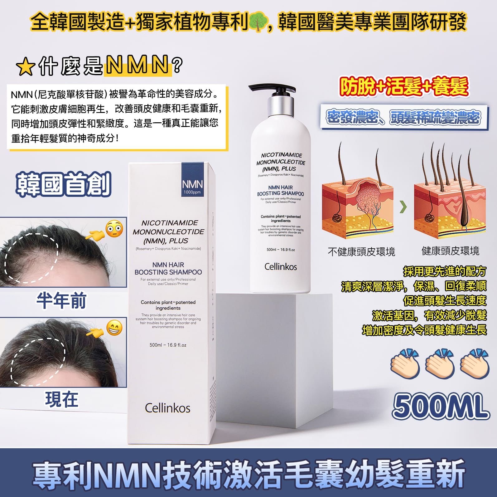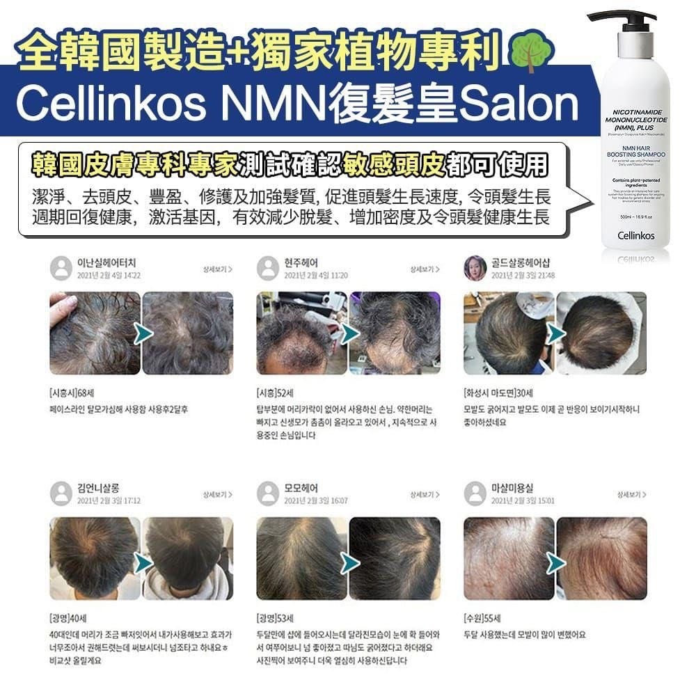 🇰🇷韓國銷量No.1️⃣ Cellinkos 💥NMN復髮皇💥500ml 2星期破10萬支記錄👏👏👏 NMN復活毛囊活髮重新洗髮 Cellinkos 💥NMN復髮皇💥 Salon Jumbo Size 500ml 巨無霸SIZE 防脫+活髮+養髮+激活毛囊 店主優惠😱💰$218/支,2支以上$208/支,4支以上$198/支 🚗約1~2星期到貨 👍全球首創 復活毛囊細胞技術 - 全韓國製造+獨家植物專利🌳,韓國醫美專業團隊研發 真的是好勁,唔試你唔知,試過你就知好 高科技產品,真的價錢合理和非常有效!!! 全世界首支採用NMN 復活因子的洗頭水 ⭐什麼是NMN? NMN(尼克酸單核苷酸)被譽為革命性的美容成分。它能刺激皮膚細胞再生,改善頭皮健康和毛囊重新,同時增加頭皮彈性和緊緻度。這是一種真正能讓您重拾年輕髮質的神奇成分! 韓國男男女女都搶👏🏻👏🏻👏🏻多個專利配方 韓國皮膚專科醫生推薦💪💪 🥇韓國首推出搶購一空 香港獨家搶先賣 十分勁的生髮系列,對脱髮或稀薄的朋友真心必用,Cellinkos 咁多年實力用家介紹未來大型廣告,但咁多年都好多客戶都是鐵粉👏👏所有產品實證!!! 記得用呢洗髮水要停留在頭皮1至2分鐘,效果非常好,主要是令毛囊復生,及延長頭髮死亡時間 - 專利NMN頭髮生長因子 : - 採用更先進的配方,能有效同時潔淨、去頭皮、豐盈、修護及加強髮質 - 第一次使用便能開始感受到初步的效果 - 清爽深層潔淨 - 保濕、回復柔順及自然光澤 - 非塗層式產品,可接觸頭皮 - 皮膚科專家測試確認敏感頭皮都可以使用 - 同時適合希望保持秀髮健康生長的年輕人士使用 - 促進頭髮生長速度 - 令頭髮生長週期回復健康 - 激活基因,有效減少脫髮、增加密度及令頭髮健康生長 💆🏼♂️💆🏼♀️復髮皇,高科技產品,真的價錢合理和非常有效!!! 全世界首支採用頭髮NMN復活因子的洗頭水 真的男女都搶👏🏻👏🏻👏🏻多個專利配方,亞洲皮膚專科醫生選用