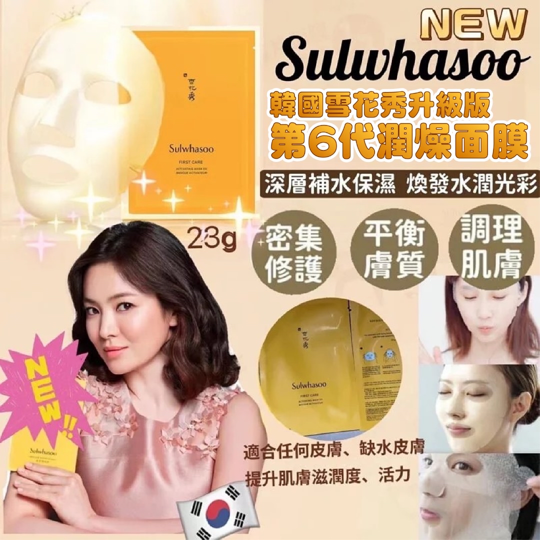🇰🇷韓國雪花秀升級版第六代潤燥面膜(一套5片) ❌❌截單日:9/5/2024 💰$138/套;2套以上$128/套 🚚🚚到貨日:7月下旬 韓國雪花秀升級版第六代潤燥面膜(一套5片) 滿滿的23G潤燥精華液浸潤在一張柔軟的面膜紙里💧 據說1片含有3分之1的潤燥精華,主打祛黃亮白⭐補水保濕💧調節水油💧平衡彈力滋養、促進後續護膚品的吸收💖 可以搭配潤燥精華使用,效果加倍、1周給肌膚1〜2次這樣的密集護理就行 也可以當作急救面膜來使用熬夜後用一片,絲毫看不出熬過夜,肌膚依舊很好💪🏻 是以人參為主要原料的韓方精華露面膜使用真的超級補水💧調和肌膚平衡,回復健康盈潤光澤💖 採用滋陰丹配方與5種珍貴原料,經過炮製提煉,凝疑煉成滋盈凝萃復合體💪🏻 幫助提升活力,彈力,通透力,修護力和滋養力💖 能亮白膚色⭐補水保濕💧修復粗糙、淡化斑點痘印、緊致抗皺去細紋,還可以急救💖 以棉絨為原材料製作的活性面膜紙,柔軟親膚,細膩貼合⭐ 活性面膜紙鎖住層層精華幫助肌膚吸收營養深徹浸透,源源水潤直達肌底⭐ 大家都知道雪花秀家明星產品就是潤燥精華啦 喜歡貼面膜的,千萬別錯過這款潤燥面膜貼,每片23g,承載了3分之1瓶的潤燥精華👍🏻 還有個好聽的名字叫做女神面膜,用了就知道有多舒服❗去黃補水效果更強大👍🏻 一打開就聞到潤燥精華的淡淡的草本味,在數面膜期間能幫助舒緩心情, 極細的棉網面膜緊密無縫的貼合面部,涼涼的很舒服,將精華成分深層滲透肌膚,讓皮膚重新回到有生機的狀態〜 -產地:韓國🇰🇷 -規格:1套5片 -保存方式:避免陽光直射,請置於陰涼乾燥。