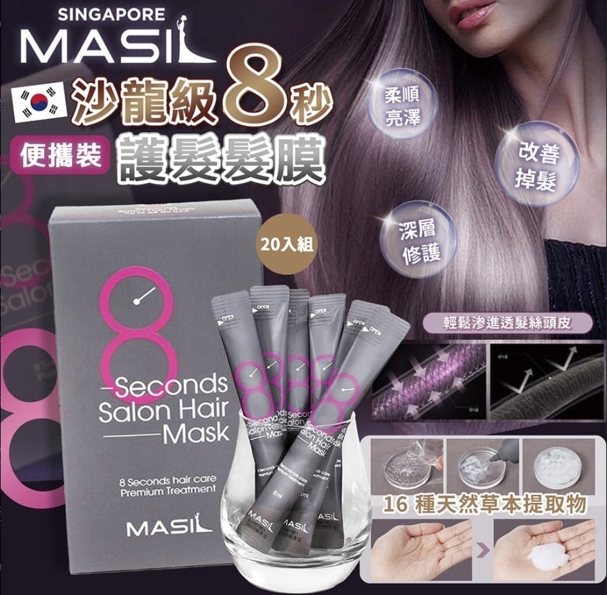🇰🇷韓國頂級 Masil 8秒沙龍髮膜便攜裝-20入 🕔截數日期 :2025年2月12日 or售完即止 💰$59/盒, 2盒或以上$55/盒 📦預計到貨: 4月下旬 👏👏正呀謂, 帶去旅行用啱曬💥 8秒就做左Treatment咁‼️ Salon 級效果😱😱 👉立即修復受損髮😉體驗柔順、光澤、修護的縮時快感!用完就像剛從salon走出來一樣👩🏻光采秀髮,魅力無法擋😍😍 呢隻🇰🇷韓國炒到超行既最新人氣🔥髮膜👍🏻係我用過最好用的髮膜,最神奇係每次只用8️⃣秒就得,💁🏻♀️效果比美髮廊幾百塊錢既護理😍用完之後頭髮超級順滑,閃閃的發亮✨光澤感爆登😮😮真係超級適合我呢啲懶人✌🏼✌🏼 繁忙湊仔或繁忙工作最適合👍🏻質地好似💦水一樣,遇到水之後就會變成乳白色的膏體狀。這個連頭皮也可以搽架。(因係是多元醇代替水,所以不堵塞毛囊)。裏面含有含1️⃣6️⃣種天然植物☘️萃取成分,蠶絲蛋白與水解膠原蛋白,用了幾次後頭髮光澤左,髮根分叉嘅部分改善左好多✌🏼✌🏼 📣韓國Masil 8秒沙龍護髮 ✔韓國頂級沙龍指定使用產品 ✔含有16種天然成分 ✔可以修復毛髮受損 ✔不含有害成份 ✔增強髮捲彈力 ✔可填充毛鱗片 ✔防脫髮功效 ✔可以止癢、去屑、預防掉髮 ✔沒有粘膩感 ✔100%韓國製造 ✅一盒20條裝 使用方法: (1)洗髮後,用毛巾將頭髮上的水份適當的擦乾 (2)在潮濕的秀髮上適當地塗持於頭皮和秀髮上(約按壓1~2次,約長度可適當調整) (3)透明的淨化液體會立刻變成白色的膏狀,輕輕的按摩 (4)過了8秒後清清水沖洗乾淨即可
