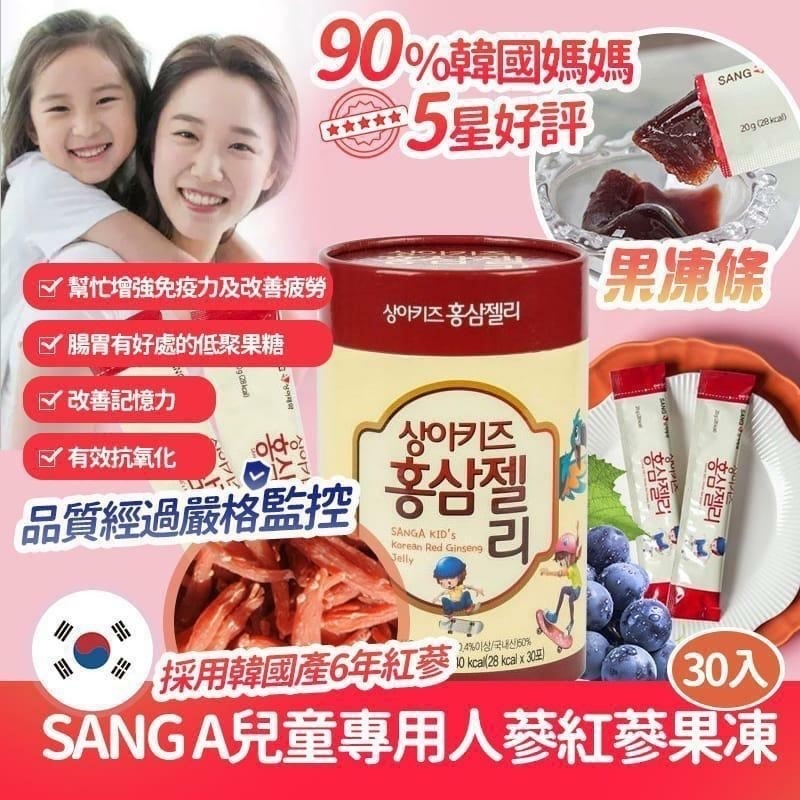 🇰🇷韓國 SANG-A 兒童紅蔘果凍條 (1罐30包) ❌❌截單日:2/5/2024 $115/罐;2罐以上$105/罐 🚚🚚到貨日:7月中下旬 仲有額外成份嘅好處 #獲90%韓國媽媽5星好評✨✨✨ 小朋友好中意出街玩🏃🏻我地更加要注重佢地嘅免疫力 🌺免疫力低都驚佢易染病😦 🇰韓國Sang-A出左一隻兒童專用人蔘紅蔘果凍🌹除左紅蔘本來嘅好處😘 ✅採用韓國產6年紅蔘 ✅幫忙增強免疫力 ✅改善疲勞 ✅有效抗氧化 ✅多種輔助成分,包括維生素同鈣 ✅採用接骨木糖漿 ✅含有維生素A, B,C同礦物質 ✅去除紅蔘嘅苦味,令到小朋友都中意 ✅腸胃有好處的低聚果糖 ✅非精製糖 ❤️紅蔘產品利用專門技術製造。 ❤️製成類似果汁果凍條 ,小朋友喜好 ❤️獨立包裝,乾淨衛生,方便攜帶,又容易食用 ⭕所有原料都經過精心挑選 ⭕品質經過嚴格監控 📍食用方法:每日1包,足30日份量 產地:韓國🇰🇷 規格:1套30包