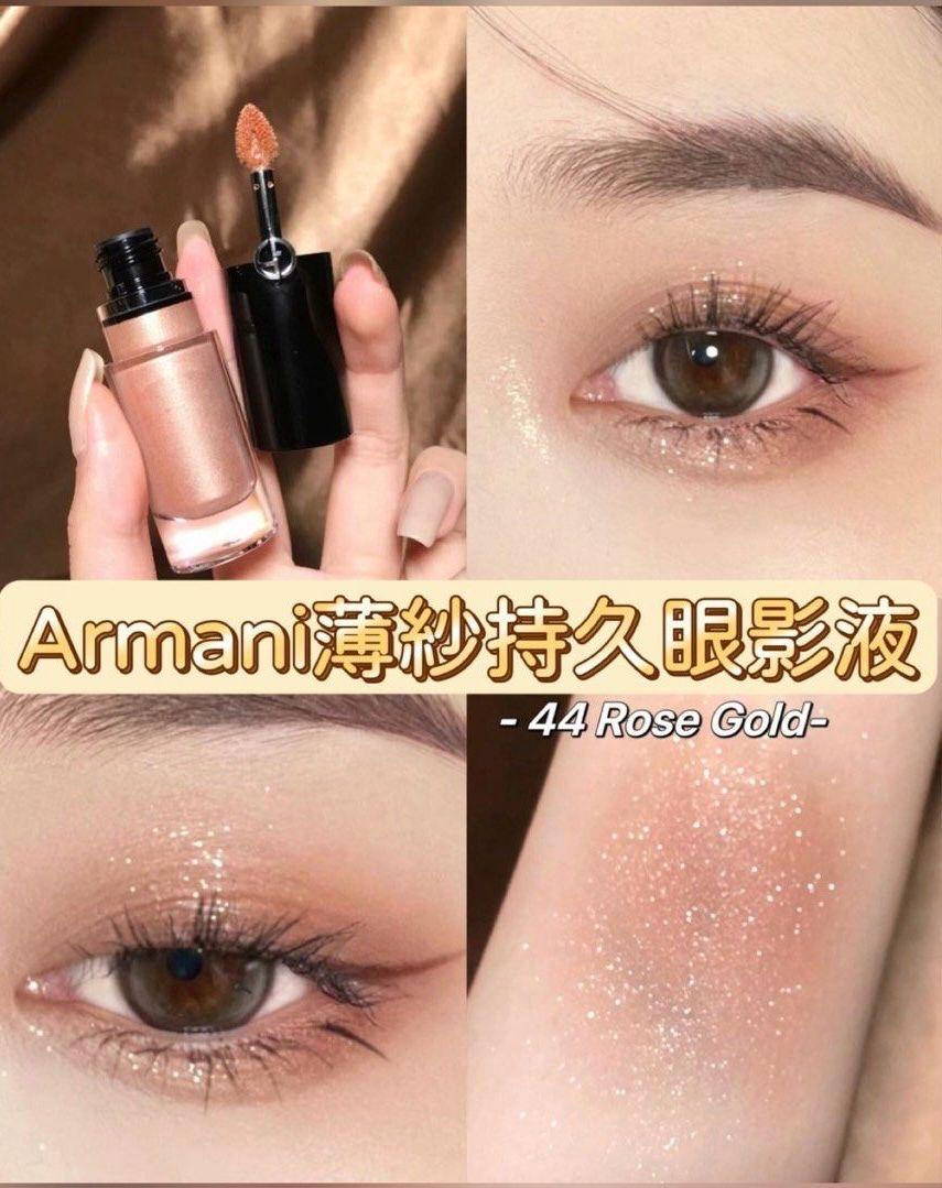 ARMANI薄紗眼影液 3ml ‼️售完即止 ✳️2色選擇: - #11 bronze - #44 Rose Gold ❌專櫃價3.9ml $325❌ 💰$98/支,2支以上$88/支 🚘2 ~3星期到貨 溫柔百搭 帶肉粉色 ✨ 提亮去暗啞 閃片細膩 自帶高級感 質地柔滑 自帶海綿棒點上 輕易推開, 自帶底色 單色完妝🎀 全眼暈染 或 疊加Highlight, 由於融膚度高 用做高光也不錯 效果柔和持久✨