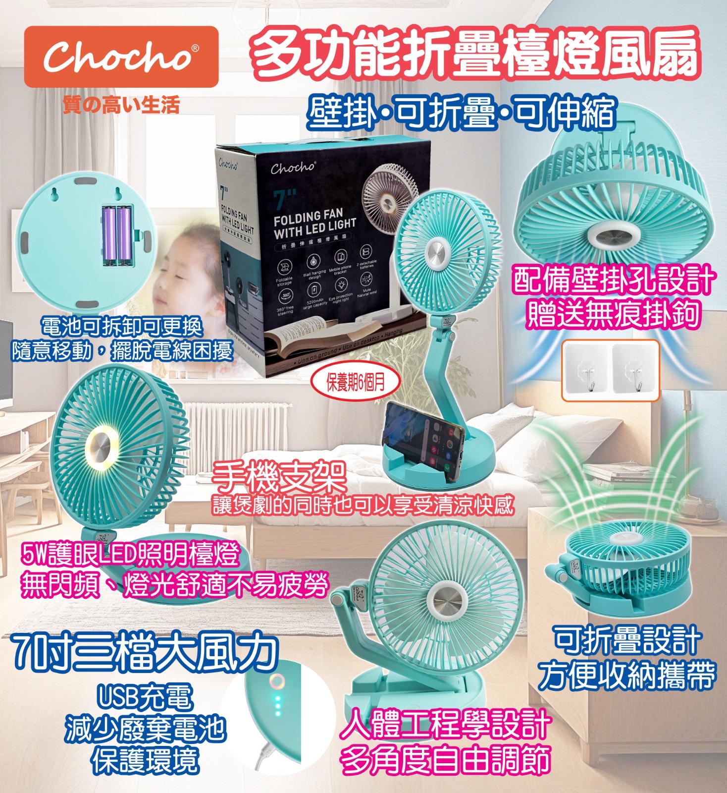 Chocho多功能折疊檯燈風扇 ❌❌截單日:9/7/2024 🙅🏻♀️🙅🏻♀️原價~$298~🙅🏻♀️🙅🏻♀️ 依家限時優惠價只需$119🤗🤗 💰$129/部;2部以上$119/部 🚗🚗到貨日:8月中下旬 ‼️‼️壁掛•可折疊•可伸縮‼️‼️ 😍一物多用:檯燈、座檯風扇、掛牆風扇 ✅體積小巧,僅重0.6kg,折疊後高9cm ✅多關節位置可調、任意角度送風或照明角度 ✅三段風速:弱 - 中 - 強 ✅靜音及低噪音設計,弱風速僅30分貝 ✅5W護眼LED照明檯燈,無閃頻、燈光舒適不易疲勞 ✅風扇底座配備掛牆孔及撕貼式掛鉤,可隨意安裝在牆壁或其他平面 ✅備有手機支架底座設計可放置手機 ✅USB充電,減少廢棄電池,保護環境 ✅可隨意移動,擺脫電線困擾 ✅電池可拆卸可更換,長時間使用 💎顏色:藍色 🌈風扇參數: 📌型號:CHOCHO5312 📌電池容量:5200mA 📌輸入:5V 1.2A 📌充電時間:約需4小時 📌工作時間: 弱(微 風)-約12小時 中(自然風)-約7小時 強(強 風)-約4小時 ⭐檯燈參數: 👉🏻檯燈功率:5W-300LM 👉🏻暖光色溫:3000K 👉🏻燈光切換:睡眼模式、柔光模式、明亮模 👉🏻保護功能:過充電保護、過放電保護、過電流保護 🚨香港🇭🇰行貨半年保養🚨