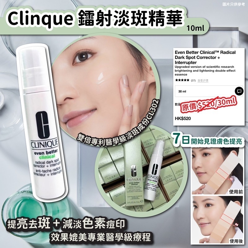 Clinque鐳射淡班精華(10ml) ❌❌截單日:5/5/2024 ❌原價 $520/30ml❌ 💰$75/支;2支以上$65/支 🚚🚚到貨日:7月中下旬 ✅CLINIQUE突破性推出全新第3代升級版 - 升級版勻淨科研亮白淡斑雙效精華 (別名: Laser 淡斑去印精華) , ✅以雙倍專利醫學級淡斑成份CL302-提亮去斑 + 減淡色素痘印,效果媲美專業醫學級療程 . ✅配合日本玉露萃取及米糠萃取成分,修護肌膚屏障,預防皮膚炎症,防護肌膚免受遊離基侵害, 預防未來的色斑形成。 ✅7日開始見證膚色提亮,1瓶締造醫學級鐳射勻淨肌 🔸規格:10ml 🔸到期日:2025年3月或之後
