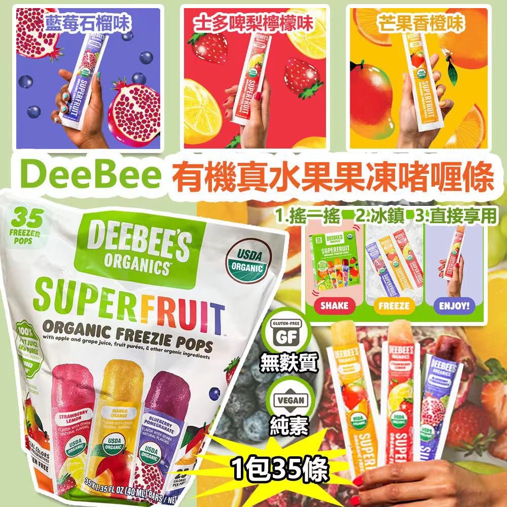 DeeBee 有機真水果果凍啫喱條 (1包35條) ❌❌截單日:2/5/2024 💰$169/包;2包以上$159/包 🚚🚚到貨日:7月中下旬 嘩💥呢款含100%果汁/果泥既小果凍零食推介比屋企有小朋友既大家👍🏻 夏天至正既享受😎 🌱天然有機健康!岩曬小朋友食用😋😋 🤤🤤酸酸甜甜,🫐🍓🍋🥭🍊濃郁果味,開胃又好味 冰鎮過後,味道更佳~岩曬夏季食用~ 💛無麩質 💛非轉基因 💛純素 💛無添加糖 💛不含人工色素/香料/防腐劑/蘋果酸 💛100%果汁/果泥 💛有機食品 🤤🤤一包有三款口味(35條獨立包裝): 🫐藍莓石榴味 🍓🍋士多啤梨檸檬味 🥭🍊芒果香橙味 📝最佳食用方法: 1️⃣搖一搖 2️⃣冰鎮 3️⃣直接享用 -規格:1包35條 -美國進口 -最佳品嘗期限:約2025年8月