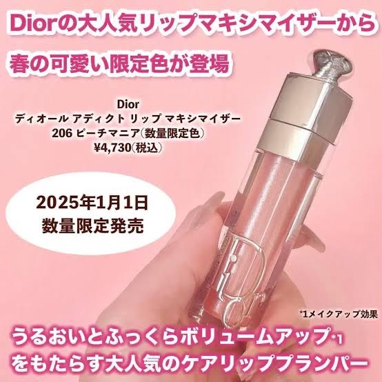 Dior 2025 春🌸限定色Dior Addict Lip Maximizer 貨裝 ‼️售完即止 💰$268/支 2-3星期到貨 ✳️2色可選擇: #053 Pinkmania #206 Peach Mania Dior 的人氣唇膏推出了可愛的春季限定色😊 這款唇蜜非常受歡迎! 含有90%的天然成分,包括櫻桃油和透明質酸! !不僅可以讓雙唇全天保持水潤,還能讓雙唇光滑豐滿、豐盈 #206 Peach Mania 是閃爍著絲般亮片的淡桃色🍑✨️略帶珊瑚色,搽上後不會太濃,素顏或淡妝亦可,亦可塗在其他唇部產品上♡ #053 Pinkmania,一種散發著精緻光芒的蛋白石 粉色,淡粉色向來都係各位靚靚首選色,超容易carry,基本上日日可以用