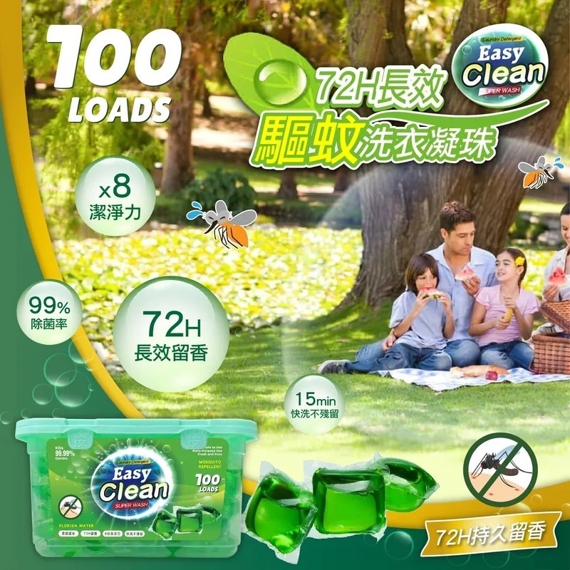 Easy Clean 72H長效驅蚊洗衣凝珠 (1套2盒) ❌❌截單日:30/5/2024 💰$68/套;2套以上$58/套 🚚🚚到貨日:7月中下旬 #大大盒 每盒100顆 #洗淨清香,同時驅蚊防蟲,一舉好幾得💪 Easy Clean 72H長效驅蚊洗衣凝珠(一盒100顆) 採用綠色配方💚💚 🧺每次洗衣只要放1顆就夠了 💜一顆=✅清潔+✅留香+✅柔順+✅驅蚊防蟲 每一顆都是8被濃縮劑潔淨力🌀 洗後的衣物散發著清新氣息🌲 不但可以去除衣服的異味,甚至抑制細菌滋生❗ 氣味還能趕跑討厭的蟲蟲❗ ✅強效4合,釋放8倍潔淨力💪💪 ✅無殘留,濃縮低泡配方,遇水即溶 ✅強效去污,不傷衣物 ✅無添加螢光劑 🫧一顆洗衣球能洗4-6件衣服 🫧直立式、滾筒式皆可使用 -規格:6g x 100顆/盒 -保存期限:期為廠商最新批次 -保存方式:避免陽光直射,請置於陰涼乾燥。 -注意事項: ※請確保將產品放在孩童和寵物接觸不到的地方 ※使用後如有不適,請暫停使用並諮詢專業醫師 ※如不小心噴到眼睛,請用清水沖洗10-15分鐘後,請立即就醫諮詢專業醫師