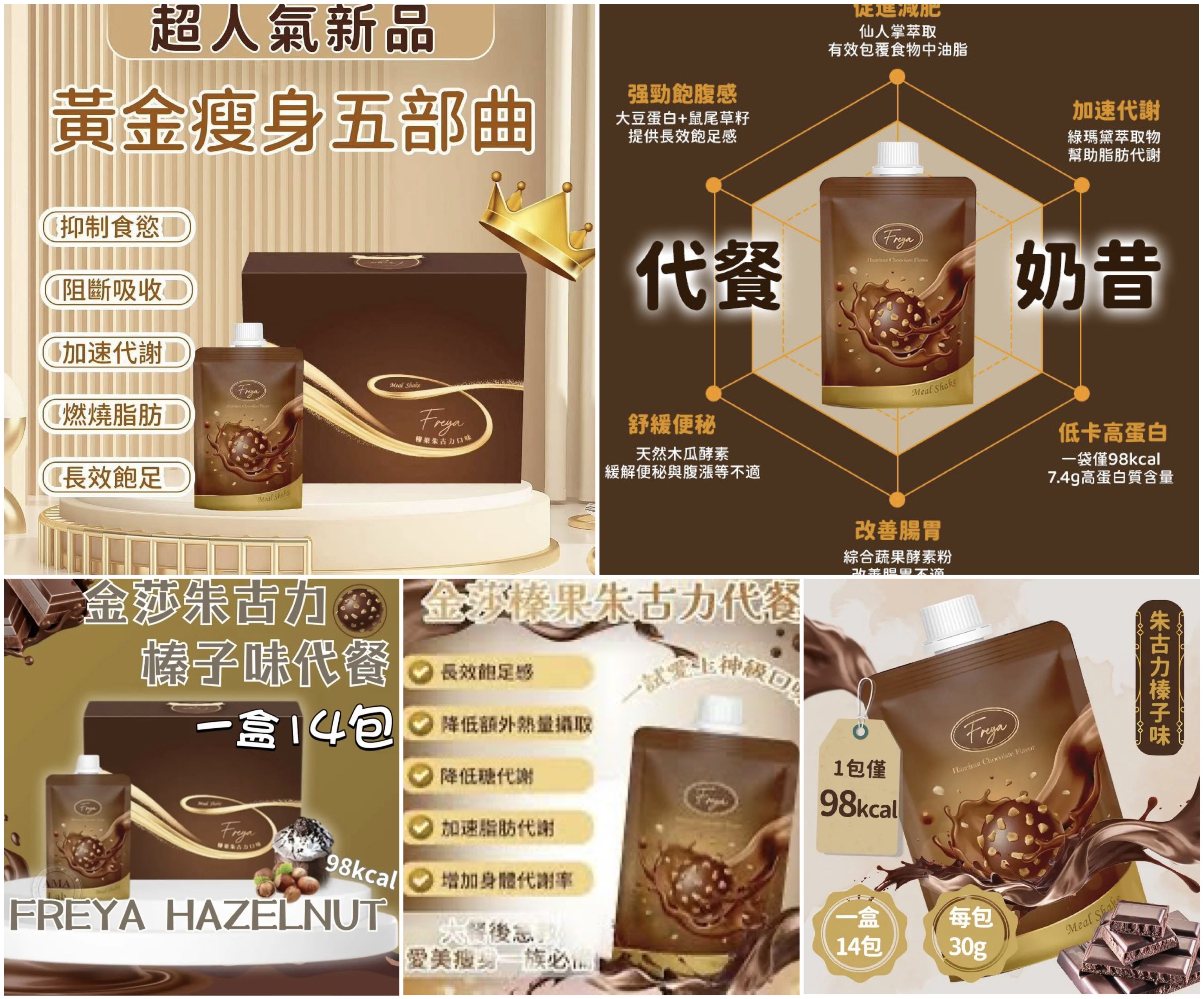 長期斷貨😵 Freya榛果朱古力味代餐 1盒14包 ‼️售完即止 出面網購價$359❌❌ 店主優惠 💰$289/盒,3盒以上$279/盒 接受預訂❤️🔥🛬預3月底到港 藝人裕美大推超好飲金莎味代餐 *✨一包只有98卡 ✨* 裕美推薦溝牛奶最好飲👍🏻 有別於傳統嘅代餐剩係得飽肚感 Freya榛果朱古力味代餐 特別加入針對瘦身的五種專利成分🤩 一包有齊27 in 1功效 味道更加係一試即愛上 主功效黃金瘦身五部曲: ✨抑制食慾 ✨阻斷吸收 ✨加速代謝 ✨燃燒脂肪 ✨飽足感 🤎只需30秒搖一搖就搞掂一餐,加水或奶沖都一樣咁好味! 每包都加入特別加入胚芽米脆粒、鼠尾草籽 ,好味又飽肚,飲一包可以維持5-6小時飽肚感。 豐富滋味。不含添加劑、防腐劑、香精、色素,飲得健康。 每一份量都獨立包裝啜啜設計,方便去街返工,只需加水/牛奶即沖隨時隨地享用,只需30秒,夠晒方便。 每包代餐粉包裝背面有沖調份量指示,只需加水或加奶再shake一shake,即可飲用,可以代早/晚餐