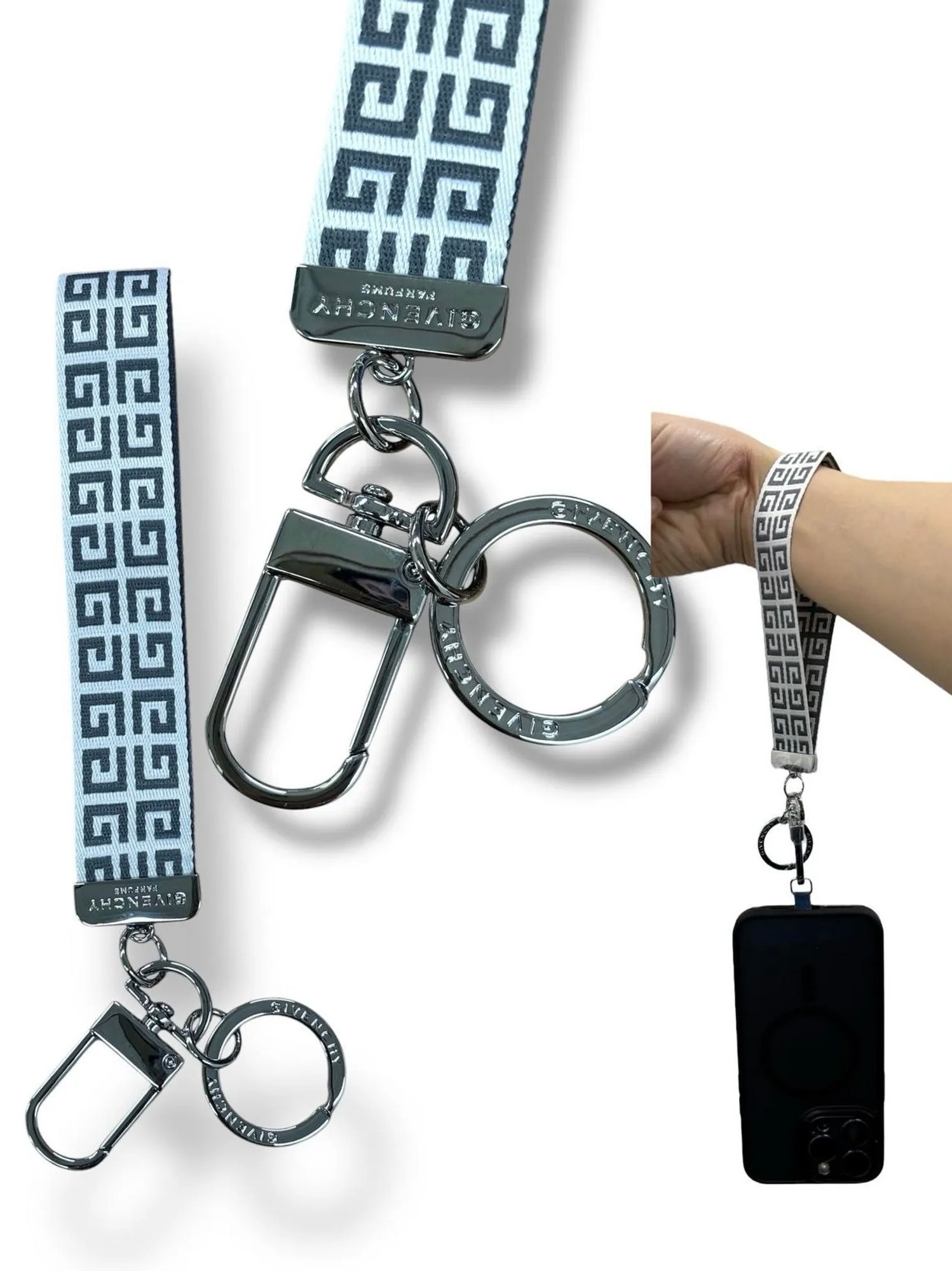 Givenchy 紀梵希限定鑰匙圈「香港專櫃」 ‼️ 數量有限,售完即截 ✳️2款選擇: A/ 黑白條紋logo款 B/ Givenchy 字母款 💰$68/條 🚘2~3星期到貨 黑白條紋是今年走秀款的同款設計 經典款的設計,金屬鎖扣,耐磨耐用 加個扣就可以當電話繩用🩷