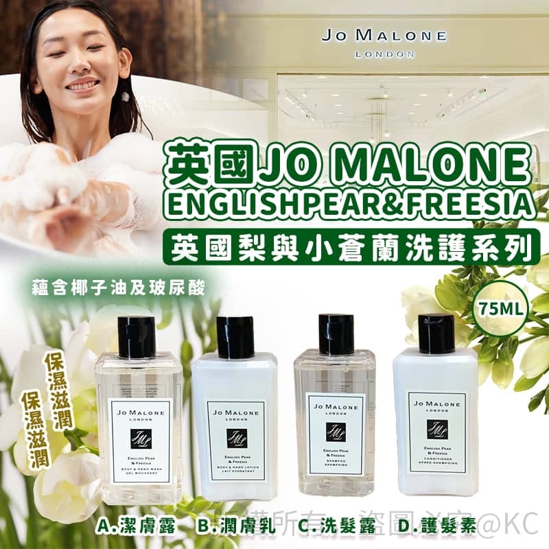 Jo Malone 英國梨與小蒼蘭洗護系列 75ML ❌❌截單日:17/6/2024 💰$57/支;2支以上$47/支 🚗🚗到貨日:8月中下旬 A. 潔膚露 B. 潤膚乳 C. 洗髪露 D. 護髮素 👏👏五星酒店專供貨源~好抵呀‼️ 今次仲係Jo Malone No.1 皇牌香味🏆 🉐 Jo Malone 英國梨與小蒼蘭洗護系列-75ML ❌專櫃 $440/250ml , 依家🈹低至 $4x/ 75ml 😍, 💕4款選: A. 潔膚露 B. 潤膚乳 C. 洗髪露 D. 護髮素 ✨超級滋潤, 富含椰子油🙈很容易被吸收,立即補充水分和調理,仲有陣陣迷人香味, 沖完涼成身香噴噴。 75ml 旅行裝, 👍帶去旅行或夏天游完水仲番個靚涼時用就啱曬!! 🌎呢排大家都鍾意出外旅遊🛫, 尤其係返國內旅行, 酒店賓館嘅淋浴產品未必啱用😔😔 咁就要帶備私伙野✌✌ 呢款Jo Malone 英國梨與小蒼蘭洗護系列唔係成日有得賣, 趁依家咁抵, 買定兩三SET 放屋企看門口啦🤣🤣 -規格: 75ml