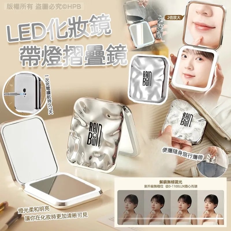 LED 化妝鏡帶燈摺疊鏡 ❌❌截單日:20/5/2024 💰$49/個;2個以上$39/個 🚚🚚到貨日:6月下旬 LED化妝鏡帶燈摺疊鏡台式桌面手持鏡係專為女仔設計嘅 非常方便攜帶同使用💄💡✨。 💗鏡面LED燈💗 呢款化妝鏡有LED燈,燈光柔和明亮, 可以提供足夠嘅照明,令你化妝或護膚嘅時候更加清晰可見💡💄。 💗折疊設計💗 採用折疊設計,方便攜帶同埋收納,可以輕鬆放入行李箱或者隨身攜帶 你可以放喺桌面上使用,亦可以手持使用,非常靈活👐🔍。 💗外觀優雅💗 外觀時尚優雅,非常適合女性使用✨💁♀ -尺寸:88mm × 76mm -顏色:銀色