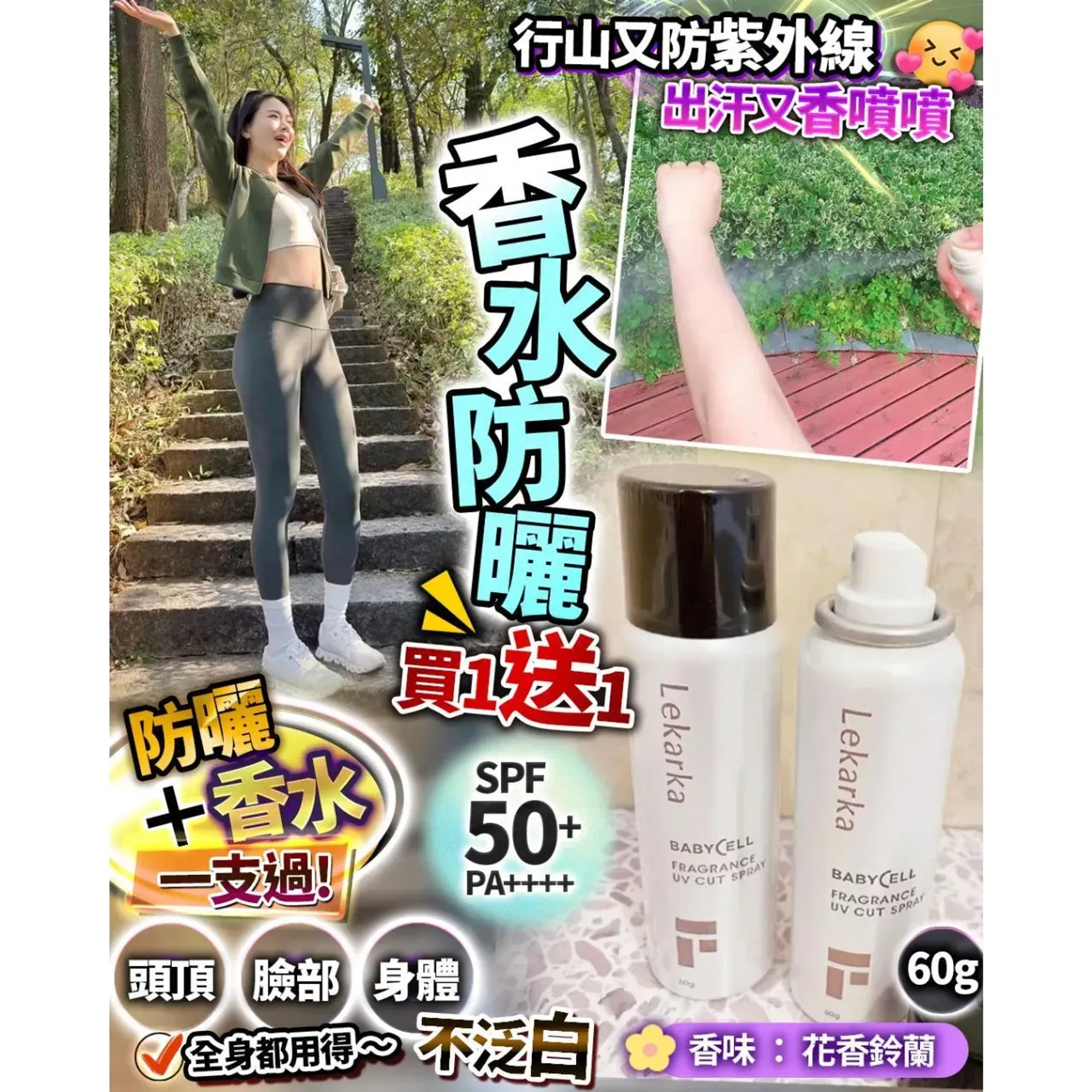 Lekarka 香水防曬 買1送1 ‼️售完即止 💰$258/支,2支以上$250/支 🚘3-4星期到貨 搶到癲 準備斷貨 最近成日啲人都問我你用咩洗衫 點解香成咁 香水都唔洗噴 成身香噴噴 60g 方便攜帶 仲要買1送1 真係閉眼狂搶唔洗諗 終於唔洗再忍受市面上好多壓縮式防曬 一噴散發沙灘味 又噴到白潺潺 嘅情況 , #白水防曬 透明配方的,所以唔會有泛白 來自日本香水防曬 全身由頭皮到腳甲尾都一齊防紫外線 + 香噴噴 強效防曬噴霧 切斷UV-A波、UV-B波,最高值SPF50+/PA++++ 奢華花香鈴蘭(鈴蘭)香味 臉部、身體、頭髮 全身都可以使用的多功能噴霧 「臉」「身體」「頭髮」難以觸及的部位,因為是噴霧型,所以可以全面進行UV護理。 富含油溶性和水溶性維生素C、富勒烯和其他美容成分,具有出色的抗氧化和抑制肌膚暗沈的功效 還含有四種氨基酸,一邊保濕一邊防曬 使用方法 : 搖勻罐子後,請遠離面板或頭髮20cm左右,噴灑均勻。