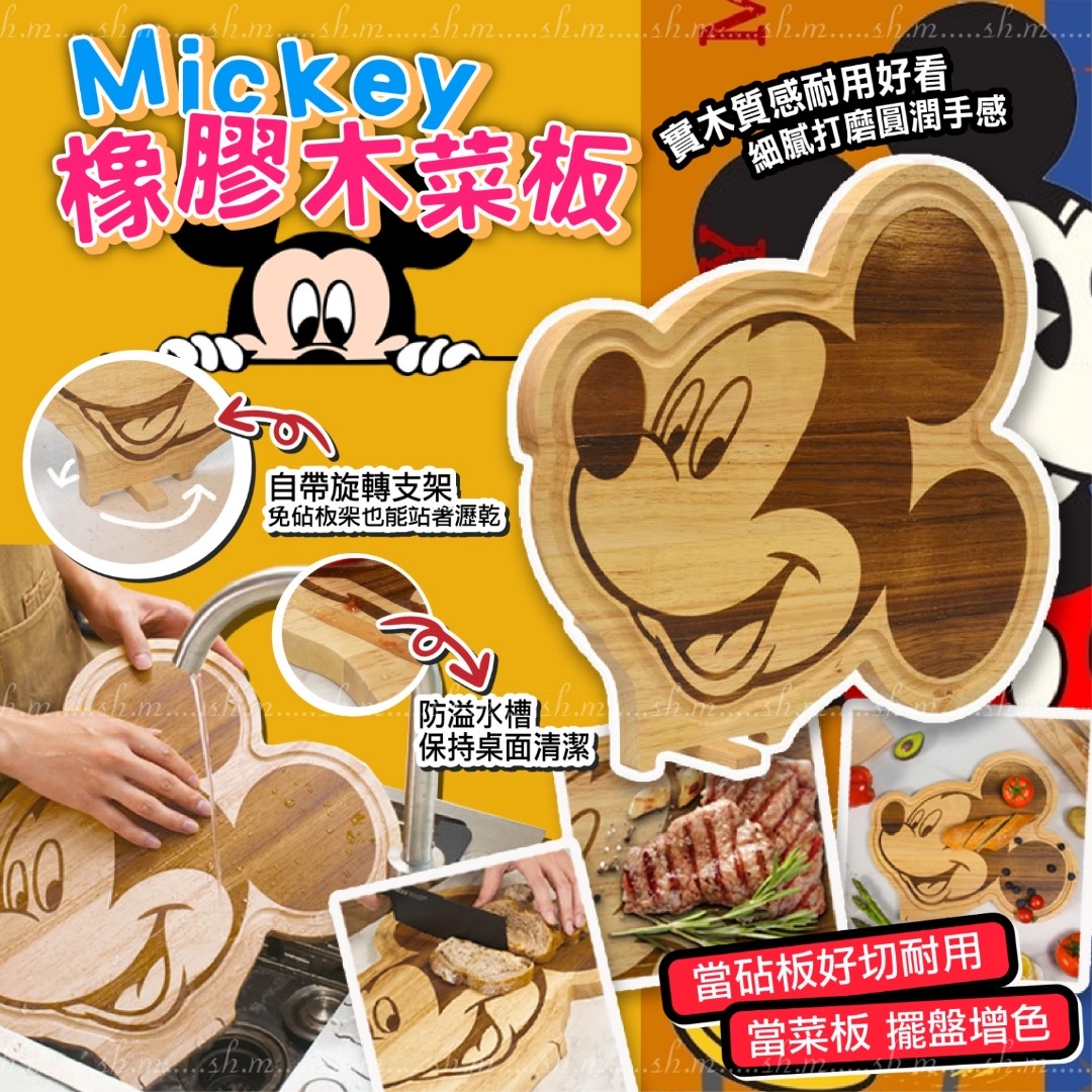 Mickey 橡膠木菜板 ❌❌截單日:17/5/2024 💰$145/塊 🚚🚚到貨日:7月中下旬 🤩可愛又實用,多功能砧板👍 ✅ 防溢凹槽設計 ✅ 橡木材質不易發霉 ✅ 旋轉支架好收納/直立 ✅ 背面凹槽設計 方便拿取 可立起來當擺件或者做菜品裝飾盤/託盤 因木紋關係,每塊都是不一樣的木紋喔