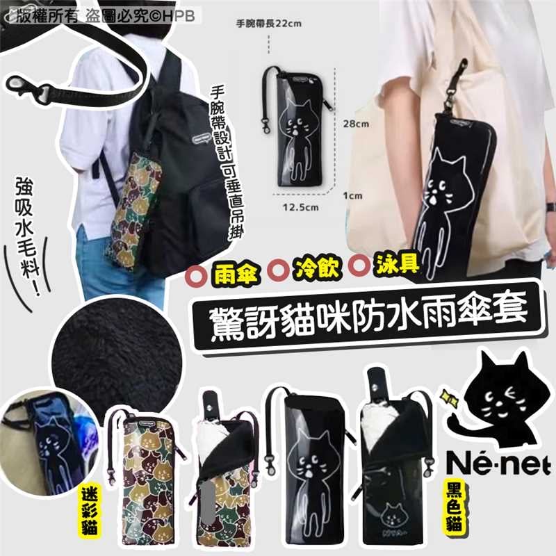 Ne-net Nya驚訝貓防水遮袋水壼袋 ❌❌截單日:26/5/2024 💰$49/個;2個以上$39/個 🚚🚚到貨日:7月下旬 款式選擇:A) 黑色 / B) 迷彩 🌧️落雨帶遮雙手拎滿野... 把遮仲係咁滴水💦好尷尬😳 不過!依款遮套容量夠大👍🏻 ☑️ 防水傘套 水壺套 ☑️ 絨毛內裡 可吸水 可放置保溫杯、泳鏡、雨傘...等 ☑️ 小掛鉤手腕提袋 非常方便攜帶 🛍️顏色: A) 黑色 B) 迷彩 📌尺寸:28*12.5*1 cm