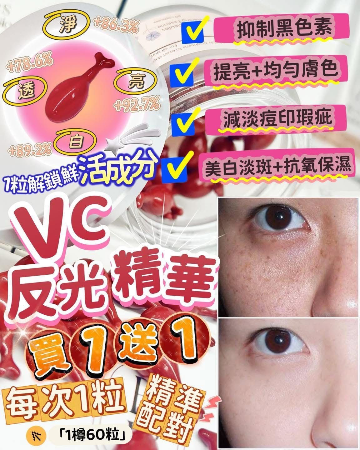 Re S Pro • VC反光精華(買一送一 )🔆 ‼️售完即止 🔥解鎖「透明肌密碼」🛜🛜🛜 ‼️買一送一‼️買一送一‼️ 一夜透亮 · 三重狙擊黑色素📡 店主偷雞🤫再優惠💰$279/套 🚘2-3星期到貨 💎 核心美白矩陣〽️〽️ ✔️ 【VC-IP】超穩維C衍生物 · 抗氧化+還原黑色素 ,提亮膚色,促進膠原蛋白的生成,減少細紋及抗衰老跡象 ✔️ 【煙酰胺】阻斷黑色素傳輸 · 改善暗黃及控油 ,具有美白肌膚、改善暗瘡、抗衰老和保濕等多重護膚 ✔️ 【熊果苷】精准淡斑· 能透過抑制酪氨酸酶的活性,從而減少黑色素生成,還具有抗氧化作用,可以保護皮膚不用受到自由基的傷害 🔬 一次一粒保鮮設計 ▫️ 獨立膠囊封裝 · 活性成分零氧化 ▫️ 次拋無菌包裝 · 輕鬆易用 📅 28天美白日程 ♻️第1周:肌膚透亮度 ♻️第2周:痘印/暗沈淡化 ♻️第4周:膚色均勻度明顯提升