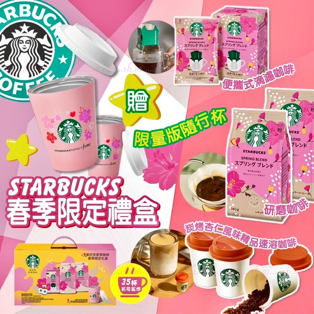 STARBUCKS 春季限定禮盒(贈限量版隨行杯) ❌❌截單日:19/5/2024 💰$248/盒 🚚🚚到貨日:7月中下旬 ⭐多款"星"風味⭐一次帶回家 🤎 中度烘焙 🤎 口感均衡 🤎 約可製作35杯 🤎 甜橙香氣和牛奶巧克力風味 🎁內容物: 1️⃣ 春意禮讚攜式滴濾咖啡 34g x 4 2️⃣ 春意禮讚研磨咖啡粉 140g x 2袋 3️⃣ 炭烤杏仁風味精品速溶咖啡 2g x 3杯 4️⃣ 春季限量版隨行杯(270ml) ✨✨✨✨ -產地:越南/日本/中國 -保存期限:依外包裝標示 📣每批效期略有不同以實際為主。 📣效期:商品銷售速度快,每批都是最新生產,依實際出廠為主。 📣包裝:依季節或每批生產可能略有不同。 -保存方式:避免陽光直射,請置於陰涼乾燥。
