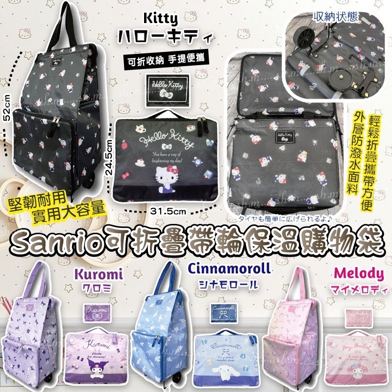 Sanrio可折疊帶輪保溫購物袋 ❌❌截單日:21/7/2024 💰$69/件;2件以上$59/件 🚗🚗到貨日:8月下旬 👍 多功能可折疊購物袋,便捷省力 大容量逛街購物好幫手💯 外層防潑水面料,堅韌耐用便攜 💯💯 耐刮好背 多功能適用 🤩 👍 可背可拖,輕鬆折疊好攜帶 🎀尺寸: H52×W31×D20cm(使用時) H24.5×W31.5cm(折畳時) #帶輪購物袋 #可折疊購物袋 #購物袋 #環保購物袋 #大容量收納袋 #買菜車 #保溫購物袋 🎀款式: A. Kitty B. Kuromi C. Cinnamoroll D. Melody