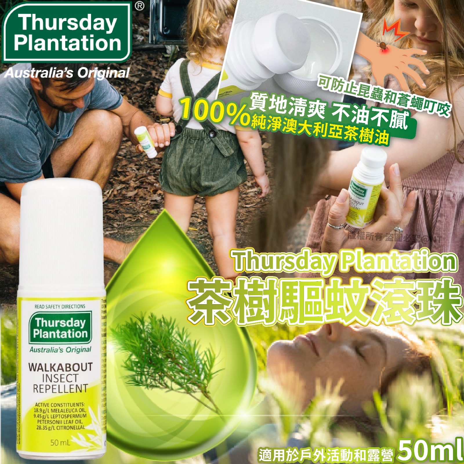 Thursday Plantation星期四農莊茶樹油驅蚊防蟲液(50ml) ❌❌截單日:3/6/2024 💰$55/支;2支以上$45/支 🚚🚚到貨日:8月下旬 夏天實在太多蚊蟲🦟🦟點算 ⁉️ 呢款驅蚊防蟲液👉含茶樹精油,🍋檸檬香茶葉油和🌿香茅天然混合而成 💁🏻♀️特別適合戶外活動、野營👏👏 ✔️質地清爽,不油不膩 ✔️滾珠使用不沾手 ✔️室內戶外都合宜 ✔️天然防蚊液 📌規格 : 50ml 📌有效期 : 2026年10月 ❗僅限於外用 ❗孕婦不建議使用 ❗避免接觸眼睛、嘴唇